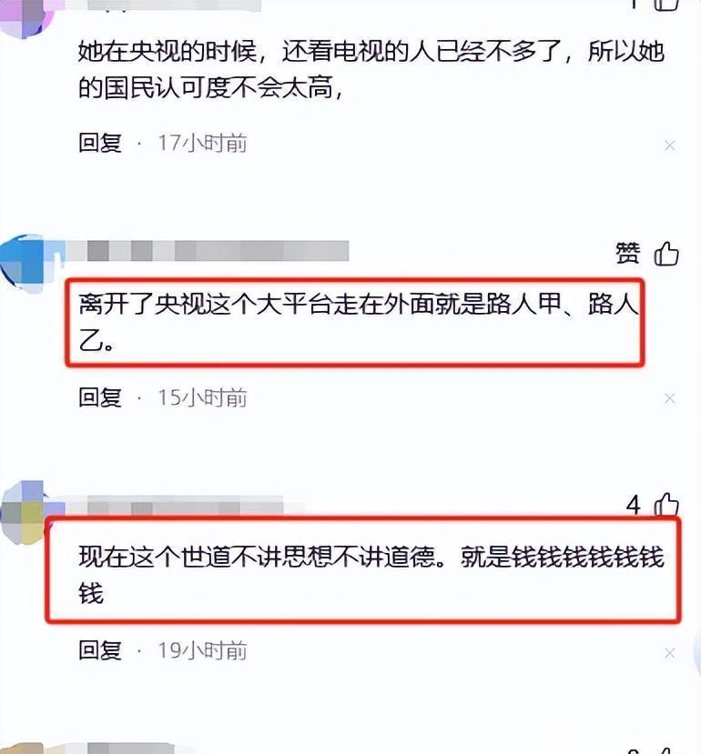 而更刺耳的是对她满身“铜臭味”的吐槽,以前主持节目大谈风骨,现在满屏都是上链接。当然也有央视老观众替她惋惜,浪费了自己的天赋,直接扎进钱堆里去了。